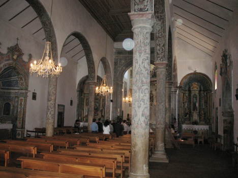 Das Kircheninnere mit seiner Haupt- und 2 Nebenkapellen ist reich geschmückt mit Malereien, unter anderem auch an den runden Säulen, die das Kirchendach tragen. Hervorstechend die Malereien an den 3 Kapellen (Capela das Almas, capela do Calvário und die capela de Santo António) und die Sammlung der Bilder aus dem 17. und 18.Jh. (Nossa Senhora do Rosário, Senhor da Paciência) sowie das Bild des Senhor dos Passos auf dem Altaraufsatz.