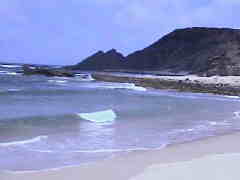 Bei Flut brandet der Atlantik recht heftig an. Das Wasser fällt flach ab, wir haben auch keine