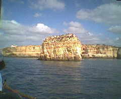 Die Fahrt führt zunächst über den Arade an Portimão und Ferragudo vorbei ins offene Meer. Obwohl es nach unserem Gefühl windstill war, begann das grosse Schiff bei der Ausfahrt aus dem geschütztem Molenberich in den Atlantik hinein,deutlich zu stampfen und schwanken, so daß es unbedingt ratsam ist, den Anweisungen der Crew, sich festzuhalten, zu folgen. Auch sonst wird Sicherheit auf dem Schiff großgeschrieben. Kinder erhalten von Anfang an eine Schwimmweste, Erwachsene werden ausdrücklich gefragt, ob sie eine wünschen. Sogar mit Rettungsinseln ist das Schiff ausgestattet. |
