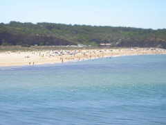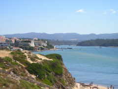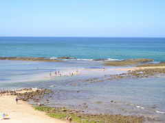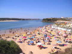 Vila Nova de Milfontes liegt malerisch am Ufer der Flusses Mira, der hier eine beachtliche Breite hat. Am südlichen Flußufer - gegenüber der Stadt - ziehen sich Strände hin, von denen man bis zu den Dünen am Atlantik wandern kann. Im flachen ruhigen Flußwasser badeten bzw.spielten bei unserem Besuch viele Kinder. Die Strände waren auch nicht überlaufen. Es gibt mehrere Parkplätze an diesem Uferabschnitt, der Zugang erfolgt über Holzbohlenwege. |