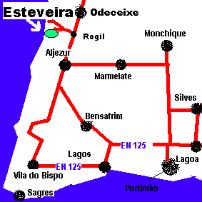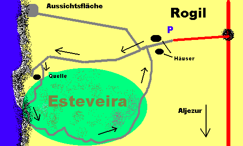 Um das einzigartige Naturschauspiel der Dünenlandschaft von Esteveira zu erleben, lohnt sich die etwas längere Anfahrt an die Westküste der Algarve. Fahren Sie zunächst bis Rogil. Der Ort liegt 7 km nördlich von Aljezur im äußersten Nordwesten. Am Bequemsten ist die Route über die EN 120 Lagos-Bensafrim-Aljezur. Am Ortsausgang von Rogil geht es links ab nach Esteveira, der Wegweiser ist nicht zu übersehen. Nach ca. 3 km endet die Asphaltstraße. Halten Sie hier an, an der Ausbuchtung rechts können Sie Ihr Auto stehen lassen. Gehen Sie jetzt nach links auf dem dunklen Sandweg Richtung Atlantik, der Weg führt Sie zwischen zwei Häusern hindurch und endet an einem Brunnen, an dem die Einheimischen ihre Wasserflaschen füllen. |