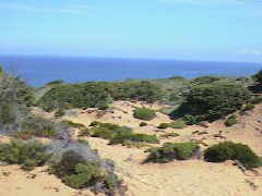 Gehen Sie weiter Richtung Süden, die Wege führen Sie etwas von den Klippen weg in die Dünenlandschaft. Sie werden nicht nur erstaunt sein, daß sich auf einem Hochplataeu überhaupt solch ausgedehnte Dünen gebildet haben, beeindruckend ist auch die Vielfalt der Pflanzen, die den Sand wie ein Blumenmeer bedecken. Besonders hübsch ist der purpurfarbene Löwenmaul, der überall aus dem grünen "Untergrund" hervorragt. Neben rosafarbenen kleinen Zistrosen wachsen Kakteen, sogar Farne ragen aus dem Sand.