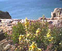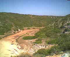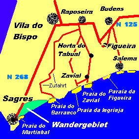 Die breite Strandbucht ist sehr steinig und windig. Nur Surfer dürften sich hier wohl fühlen, die wenigen Sonnenhungrigen am Strand hatten sich bei unserem Besuch hinter hohem Windschutz versteckt. An der Westseite des Strandes, etwa 100m landeinwärts, führt ein schmaler Trampelpfad auf die Klippen. Auf der Hochebene angekommen, haben Sie dann die Auswahl zwischen verschiedenen Wegen - doppelspurige Fahrrinnen und zT befahrbare Wege, die Sie schnell und mühlos auf "geradem Wege" nach Sagres bringen oder kleine verschlungene Pfade, die mit vielen Umwegen der romantisch-wilden Küstenlinie folgen. |