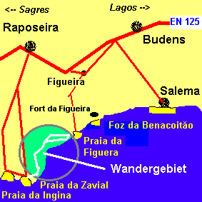 Den Strand von Zavial erreichen Sie über die N 125 von Lagos Richtung Sagres. In Höhe des Ortes Raposeira biegen Sie ab, eine Asphaltstraße führt direkt an den Strand. |