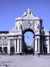 An dem riesigen Platz (34000 Quadratmeter) stand vor dem Erdbeben der Königspalast, hier wurden die Staatsgäste pompös empfangen. Eine Marmortreppe, von Säulen begrenzt, führt noch heute vom Platz hinab zum Tejo. In der Mitte der jetzt kahl gepflasterten Fläche (davor diente der Platz als Parkplatz) steht ein Reiterstandbild des Königs Jose Iaus dem Jahre 1775. Die arkadengeschmückten Gebäude um den Platz herum sind nach 1755 errichtet und beherbergen größtenteils Ministerien. Bevor Sie zurück Richtung Rossio gehen, werfen Sie noch einen Blick auf den Triumphbogen am Eingang der Rua Augusta. Auf dem 1873 fertiggestellte Bogen sehen Sie rechts neben dem königlichen Wappen Vasco da Gama und den Marquês de Pombal, links Viriatus (Volksheld, er kämpfte für das alte Lusiranien gegen die Römer) und Nuno Alvares Perreira (ein Feldherr, der siegreich gegen die Spanier kämpfte). Die lateinische Inschrift besagt: "Zur Verewigung der Tugenden unserer Vorfahren". Sie hat nicht viel bewirkt, 1892 mußte Portugal den Staatsbankrott erklären.