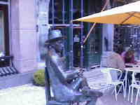 Wenn Sie noch fit sind, gehen Sie durch das Chiado Viertel zurück - es geht immer nur bergab! Zunächst folgen Sie der Rua da Misericordia in südlicher Richtung bis zum Praça Luis de Camões, einem langgezogenen baumbestandenen Platz mit dem Denkmal des berühmten Dichters. Jetzt geht es links ab, über den Largo do Chiado und am dem bekannten Cafe A Brasileira vorbei. Es war einmal ein Treffpunkt der Künstler und Literaten der Stadt. Vor dem Cafe sitzt, in Bronze gegossen, der Dichter Fernando Pessoa, der dort Stammgast war. Die Inneneinrichtung des 1922 gegründeten Cafes ist sehenswert, ob Sie in der dort herrschenden hektischen Betriebsamkeit auch einen Kaffee trinken möchten, bleibt Ihnen überlassen.
