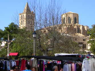 Vielfach als noch autentischer Bauernmarkt mit Vieh, Gerätschaften für die Landwirtschaft und Obst und Gemüse gepriesen, war unserer Eindruck ein anderer. Etwa 90% der Aussteller handelten mit Textilien, Leder und Handwerk. Die Tiere mussten wir geradezu suchen und darüberhinaus waren höchstens 2-3 Händler mit landwirtschaftlichen Geräten anzutreffen. Es gab nur wenig Stände für Obst und Gemüse, an dem auch kaum eine mallorquinische Hausfrau zu sehen war. Mindestens 80% der Besucher waren Touristen, die den in grosser Zahl am Bahnhof geparkten Bussen entstiegen waren. Am interessantesten fanden wir noch die Stände mit Kunsthandwerk direkt um die Kirche herum |