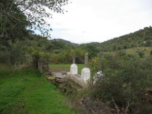 Zunächst geht es die den Müllcontainern gegenüberliegende Asphaltstrasse hoch an ein paar Häusern vorbei, dann auf einem von alten Mauern eingefassten Feldweg zwischen Olivenplantagen bergan. Ein alter Brunnen am Weg (Poço do Monte Negro) ist die erste "Sehenswürdigkeit". |