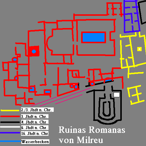 Die Wissenschaftler sind sich einig, daß sich in Milreu einmal ein römisches Landgut befand. Um die Bevölkerung und die Soldaten mit Lebensmitteln zu versorgen, forcierten die Römer nämlich bereits im 2. und 1. Jhdt. v. Ch. die Besiedelung ländlicher Bereiche und bemühten sich um eine Verbesserung der Produktionsmethoden. Zu diesem Zweck wurde das Hinterland mit villae rusticea (Landgütern) bebaut. Die zunächst noch kleinen Gebäude - in Milreu sind die Teile aus dem 1.Jhdt. n. Ch. noch nicht erforscht - wurden im 2. Und 3. Jhdt. n. Ch., als auch viele Grundbesitzer aus den Städten auf ihren "Landsitz" zogen, vergrößert. Die Inneneinrichtung wurde mit Mamorfußböden und Mosaiken luxuriös gestaltet, Bäder angelegt. Milreu ist ein "Prototyp" eines solchen römischen Landgutes.