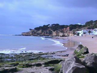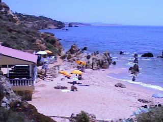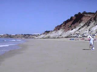 Linkerhand an der Gaststätte vorbei kommen Sie auf einem kleinen Holzbohlenweg bequem an den Strand, der sich stolz mit einem nagelneuen und grossem Werbeschild "Praia com badeira azul" brüstet.