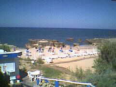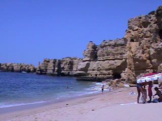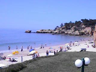 Die relativ kleine Bucht ist rechts und links eingerahmt von ca 15 m hohen Felsen, die sich im Wasser fortsetzen. Dazwischen ist jedoch genug Platz, um gefahrlos baden zu können. Der Sand ist sehr fein und sauber, nur am Wasser waren Steine angespült. Der Strand ist etwa zu 2/3 bewirtschaftet, d.h. mit Liegen und Schattendächern "beflastert". Wer dafür kein Geld ausgeben will, muß sich mit einem Platz am rechten Rand begnügen. Aus diesem Grund bewerten wir den im übrigen jedoch sehr sauberen und gepflegten Strand nur mit "empfehlenswert".