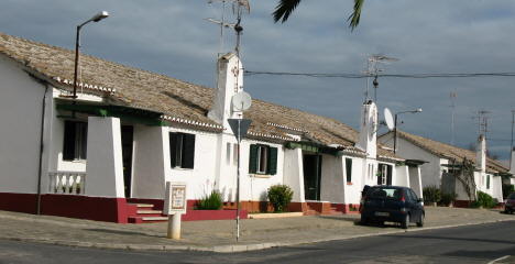 Hinter der Kirche gehen Sie links die Strasse hoch zu einer kleinen mit Blumen, Palmen und einer Wasserzapfstelle versehenen Grünfläche. Sie kommen vorbei an geduckten, langstreckten, alten aber zum grossen Teil renovierten, weissgetünchten Häusern, die alle im gleichen Stil errichtet sind. Ähnliche Häuser haben wir an der Ostalgarve oft gesehen - so z.B. auch in Fuzeta. Wir konnten bislang nicht ermitteln, wie diese Häuschen entstanden sind. Sozialwohnungen, Fischerhäuser aus dem letzten Jahrhundert, Bauträger?