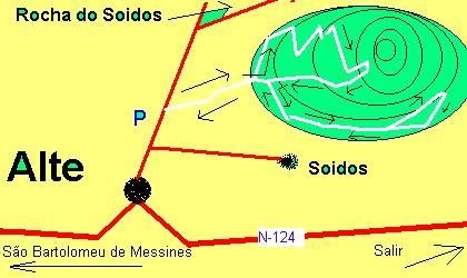 Fahren Sie zunächst nach Alte und steuern Sie die Dorfmitte an (Abzweigung von der EN 124 nach links). In Höhe der Kirche führt eine sehr schmale Straße links aus dem Dorf heraus immer bergauf. Nach etwa drei Kilometern befindet sich links der Straße ein Picknickplatz, von dem Sie einen wunderbaren Rundumblick auf die umliegende Landschaft haben. Parken Sie hier und gehen Sie die Asphaltstraße etwa 200m zu Fuß weiter, bis rechts eine braune Staubstraße abbiegt. Auf dieser wandern Sie auf eine Ansiedlung von Häusern zu, durch die eine betonierte schmale Straße (nach links) führt.