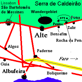 Wandern Sie auf diesem Weg, der nach links Richtung Osten ohne Steigungen am Berg entlang führt, weiter. Sie kommen an einem eingezäunten Hausgrundstück vorbei, danach haben Sie einen fantastischen Blick über die Berge bis zum Meer. Sie können - immer mit freiem Blick nach Süden - auf dem Weg noch etwa eine halbe Stunde weitergehen. Dann allerdings versperrt ein Drahtzaun Ihnen den Weg. Dichtes Gestrüpp verhindert ein Weitergehen. Also müssen Sie umkehren und auf dem gleichen Weg zurück Richtung Dorf gehen; dennoch wird es Ihnen angesichts des stetigen "Superblicks" über die Serra de Caldeirão mit Sicherheit nicht langweilig werden!