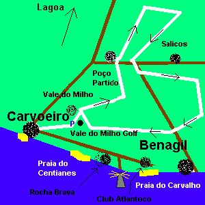 Ausgangspunkt des Spaziergangs ist der Eingang zum Golfplatz Vale do Milho in Carvoeiro. Wegweiser zu diesem Golfplatz stehen an nahezu jeder Straßenecke, so daß Sie keine Schwierigkeiten haben dürften, dorthin zu kommen. Falls Sie mit dem Auto kommen, Parkplätze an der Straße sind vorhanden. |