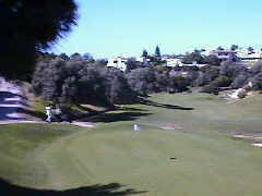 Von dieser Straße biegt rechts ein Weg zum Golfplatz Vale do Milho ab, und zwar an der noch im Bau befindlichen Anlage Golfemar. Die Abzweigung ist nicht zu übersehen, Springbrunnen, Palmen und ein riesiges Schild sind Hinweise. Nachdem sie hier rechts abgebogen sind, folgen Sie der Straße bis zur nächsten Kreuzung und wenden Sie sich dann nach links. Sie gehen direkt auf den Golfplatz zu . Wenden Sie sich nach rechts und umrunden Sie nun den Golfplatz, zwischen den Häusern haben Sie immer wieder einen schönen Blick auf den Golfplatz und den Atlantik.