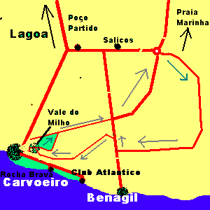Ausgangspunkt des Spaziergangs ist der Eingang zum Golfplatz Vale do Milho in Carvoeiro. Wegweiser zu diesem Golfplatz stehen an nahezu jeder Straßenecke, so daß Sie keine Schwierigkeiten haben dürften, dorthin zu kommen. Falls Sie mit dem Auto kommen, Parkplätze an der Straße sind vorhanden. |