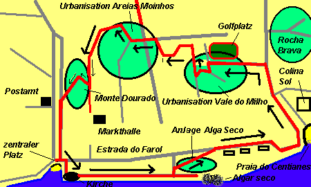Weiter gehts ortsauswärts direkt am Atlantik bis die Straße nach links zur Appartementanlage "Algar Seco" abbiegt. Lohnenswert ist hier ein Abstecher zur Felsformation Algar Seco - nur ca 150m weiter geradeaus. Wieder zurück gehen Sie auf die Rezeption dieser Anlage zu (an der Strasse in Richtung "Rua de Farol") und biegen Sie dann rechts an der Rezeption vorbei in einen schmalen öffentlichen Weg ab, der weiter ostwärts wiederum in die "Rua de Farol" mündet.