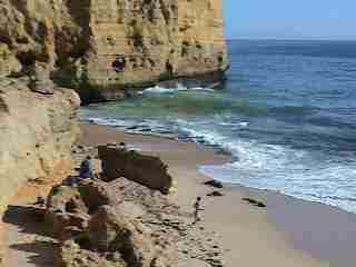 Folgen Sie nun dieser Straße ortsauswärts. Sie kommen zunächst am Hotel Almansor vorbei, später folgen hinter Grünanlagen versteckt die Anlagen "Cristal" und "Palm Gardens". Die Straße macht dann einen Bogen nach links. Rechterhand blicken Sie in einen Taleinschnitt, auf der anderen Seite fällt Ihr Blick auf die Apartementanlage "Colina Sol". Wenn Sie Lust haben, steigen Sie die gemauerten Treppen hinunter zum "Praia do Centianes", der schönsten Badebucht in Carvoeiro. (Bild rechts) |