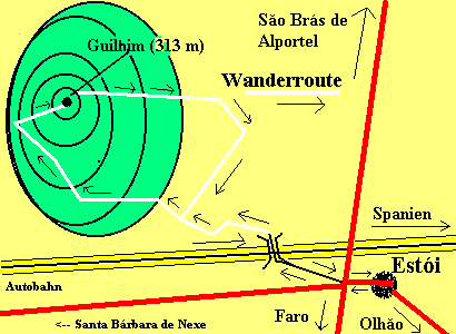 Der 313m hohe Guilhim liegt etwa 4 km westlich von Estói. Von seinem Gipfel haben Sie einen wunderbaren 360° Rundumblick. Insbesondere die Umgebung von Faro, durch die Sie als Tourist meist nur mit dem Auto fahren, liegt Ihnen wie eine Landkarte zu Füßen. |