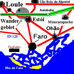 Gehen Sie nun über die schmale Brücke zur Hauptstraße Faro/São Bras. Auf der anderen Straßenseite befindet sich eine Asphaltstraße, wenige Meter rechts daneben eine helle Staubstraße. Auf dieser Staubstraße geht es weiter, der Ort Estói liegt hinter Ihnen. |