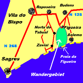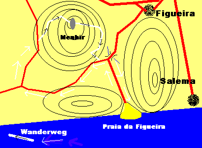 Nachdem Sie sich am Strand umgesehen (und eventuell gebadet haben ?) haben geht es zurück zur Brücke und dann links ab. Der breite Feldweg führt Sie an einem Haus vorbei, links und rechts erheben sich Berge. Etwa nach 10 Minuten öffnet sich der Blick, Sie sehen über den Atlantik bis nach Sagres. Der Weg führt immer geradeaus Richtung Westen und gabelt sich dann. Nach links geht es weiter zum nächsten Strand, nach rechts bergan Richtung EN 125. An dieser Stelle wandern Sie auf dem rechten Pfad weiter. Sie überblicken die gesamte Umgebung und werden rechts auf der höchsten Erhebung einen großen sehr hellen Stein entdecken, der auf den ersten Blick wie ein geodätischer Vermessungspunkt aussieht. Auf diesen Stein halten Sie zu.