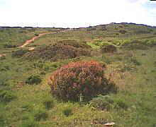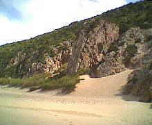 Je mehr Sie sich dem Atlantik nähern, desto schlechter wird der Schotterweg. In einer Kurve überqueren Sie in einer Furt (mit provisorischer Brücke)ein Flußbett. Direkt hinter dieser Brücke führt der Weg zum Strand links weiter, geradeaus etwas bergan verläuft ein weiterer Weg. |
