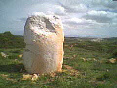 Auf einem schmalen Trampelpfad (rechts ab querfeldein) erreichen Sie den Stein. Auf der Höhe angekommen genießen Sie einen imposanten Rundumblick. Bei dem großen hellen Stein, dem offensichtlich die Spitze fehlt, handelt es sich um einen etwa 4000 Jahre alter Menhir. Der "Monolith von Aspradantes" steht noch an seinem ursprünglichen Platz, eine Seltenheit (die meisten Menhire wurden zerschlagen und die Teile "verschleppt").