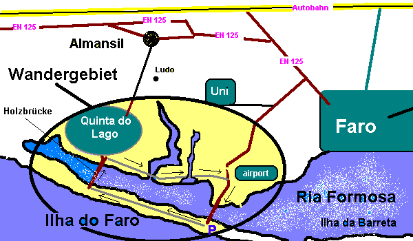 Um zu dem Startpunkt dieser Wanderung zu gelangen, fahren Sie mit Ihrem PKW Richtung "Aeroporto Faro", biegen also in Sichtweite von Faro von der EN 125 ab. An dem kleinen Ort Montengro vorbei gelangen Sie nach wenigen Kilometern zu dem letzten Kreisverkehr vor dem Flughafen. Hier biegen Sie rechts ab, fahren zunächst durch ein kleines Waldgebiet und gelangen schliesslich über eine einspurige, ampelgesteuerte Brücke, auf die Halbinsel "Ilha do Faro". Direkt hinter der Brücke befindet sich ein grosser asphaltierter Parkplatz.