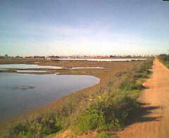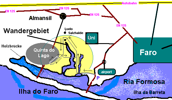 Diese Wanderung - eigentlich ein ausgedehnter Spaziergang - führt Sie durch das Marschgebiet der Ria Formosa in der Nähe des Flughafens Faro. Westlich des Flughafens bis zur Urbanisation Quinta do Lago gibt es zahlreiche Salinen und Wasserarme, die von schnurgeraden Wegen getrennt werden. Hier können Sie gut radfahren, joggen, reiten oder einfach (mit Hund) spazierengehen. Das wissen natürlich auch die Farenser, die sich hier besonders an Wochenenden sportlich betätigen. Aber auch während der Woche sind Sie in diesem Gebiet nie "einsam". Eine Warnung: Sie sind gnadenlos der Sonne ausgesetzt, nur am Rand eines Golfplatzes gibt es Schatten. |