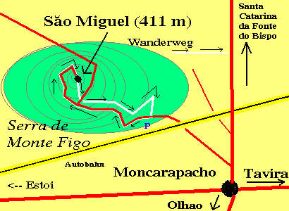 Verlassen Sie die Autobahn bei der Abfahrt Olhão/Moncarapacho und fahren Sie Richtung Moncarapacho. Nach etwa 2km biegt rechts eine schmale Straße ab, die mit "Cerro de São Miguel" und "Capela" deutlich ausgeschildert ist. |
