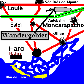 Es empfiehlt sich, eine Landkarte mitzunehmen um "von oben" die unter Ihnen liegenden Städte und Inseln besser zuordnen zu können. Schon von Ihrem Startpunkt aus haben Sie einen wunderschönen Blick zunächst auf die Stadt Olhão und das Lagunengebiet der Ria Formosa. Deutlich zu erkennen ist ein weißer Leuchtturm auf der (etwas westlich) vorgelagerten Insel, der Ilha do Farol. Wandern Sie nun die frisch asphaltierte und sehr verkehrsarme Strasse bergan - den Antennenwald auf dem Gipfel vor sich und zur linken stets neue Ausblicke auf die Algarveküste, die sich immer mehr nach Westen öffnet, je höher und weiter Sie wandern.
