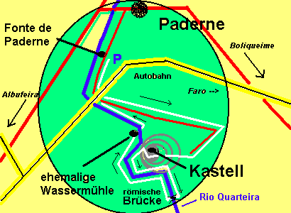 . Wenn Sie - Paderne im Rücken - vom Berg herab Richtung Südosten sehen, erblicken Sie unter sich den "Ribeira de Quarteira" , der von einer dreibögigen alten Brücke überspannt wird. Die Brücke ist römischen Ursprungs, allerdings sind nur noch die Fundamente alt. Alles andere wurde im 16.Jht. erneuert.