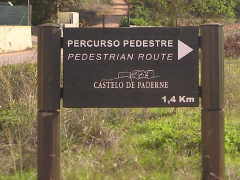 Gehen Sie nun auf der Asphaltstraße noch einige Meter weiter. Kurz hinter einem Gebäude geht es dann rechts ab. Der Wanderweg wird mit dem Schild "Percurso Pedestre" angezeigt. Er führt im Flußtal, das landwirtschaftlich genutzt wird, unter der Autobahn hindurch. Kurz hinter der Autobahnbrücke gabelt sich der Weg. Der Hauptweg zur Burgruine führt nach links. Bevor Sie auf diesem Weg weiterwandern, biegen Sie kurz nach rechts ein und informieren sich auf einer auch in englisch beschrifteter Schautafel über den Rundweg, Fauna und Flora sowie heimische Tiere.