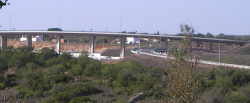 Linkes Foto - Blick vom Kastell in Richtung Paderne jenseits der Autobahn Via do Infante. Die Autobahnbrücke überspannt das Tal des Ribeiro de Qarteira. ![]() | Von der Burg aus gesehen: Via do Infante |