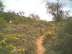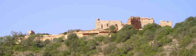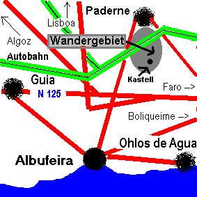 Zurück zur Weggabelung und zum Hauptweg, der links abbiegt. Folgen Sie diesem breiten befahrbaren Weg, der sich bald noch einmal gabelt - hier bitte rechts halten. Unterwegs werfen Sie einen Blick nach links - Sie sehen dort auf dem benachbarten Hügel ein Geröllfeld und Spuren vieler kleiner Umfassungsmauern - es handelt sich hierbei um die Trümmer des 1755 durch das Erdbeben zerstörte "alte" Paderne, einer kleinen mittelalterlichen Ansiedlung im Schutz der Burgmauern.