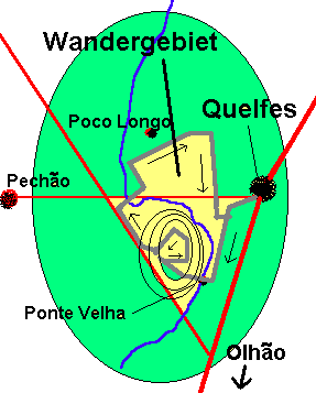 Ein Blick von der Bergkuppe hinab ins Tal von Quelfes lohnt sich - um die Bergkuppe zu erreichen, folgen Sie hinter der Brücke der Asphaltstraße bis zur 1. geteerten Abzweigung nach rechts. Hier geht es direkt auf die Kuppe, die Mauer an der Abzweigung trägt die Aufschrift: "Monte Joaq. Victor V." .Folgen Sie dem Weg bis zu seinem Ende, biegen dort nach rechts und 100m weiter vor dem dort befindlichen Haus nach links in "Feld und Flur" ab.