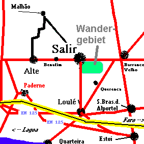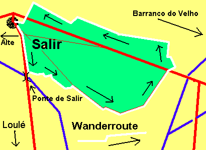 Folgen Sie dann der Hauptstraße ortsauswärts Richtung Loulé. Nach etwa 10 Minuten Fußmarsch taucht im Tal das Schild "Ponte de Salir" auf, davor führt ein breiter Feldweg links ab (der Feldweg ist für die aus Richtung Loule Kommenden mit dem Schild "Pomar" gekennzeichnet). |