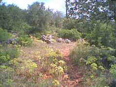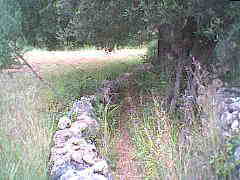 Er endet vor einem noch bewohnten kleinen Bauernhaus. Jetzt geht es bergab ins Tal, und zwar direkt an der Korkeiche, die rechts am Wegesrand steht. Dies ist die einzige Stelle, an der der Hosenboden Schaden nehmen kann - Sie müssen eine Steinmauer etwa 2m tief hinunterklettern. Nach Überqueren eines ausgetrockneten Bachbettes wenden Sie sich nach links und sobald Sie an eine Mauer stoßen wieder nach rechts.