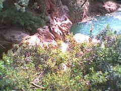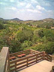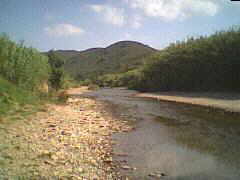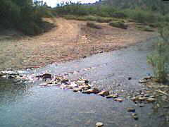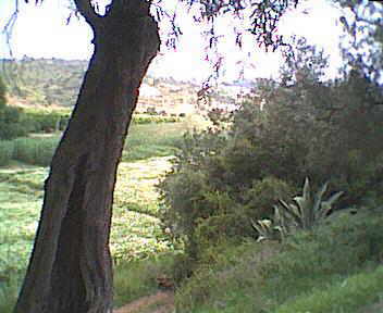 Hinter dem Bauernhaus führt eine breite Landstraße nach links Richtung Chacopo. Dieser Straße folgen Sie eine Weile. Es geht rechts und links an ausgedehnten Orangenplantagen vorbei, dann taucht etwa 3 m hohes Schilfrohr auf. Danach kommt eine kleine Brücke, kurz darauf in einer Rechtskurve führt eine breite helle Sandstraße links ab. Auf dieser Sandtraße gehen Sie weiter, wieder an Orangenhainen und Bambuswäldern vorbei. Dann öffnet sich der Blick in das breite Flußtal. Jetzt sind es noch ca.1,5 km ,bis an der Straße links ein Halteverbotsschild auftaucht, daneben eine Kettenabsperrung. Nach wenigen Metern folgt links ein 2. Halteverbotsschild, an dem ein breiter Pfad direkt zum Flußbett hinunterführt. Den Fluß müssen Sie überqueren, eine Brücke gibt es nicht. Bei unserem Besuch im April hatten Wanderer bereits Steine gelegt, im Sommer ist der Fluß ohnehin ausgetrocknet, durchwaten ist natürlich auch eine Möglichkeit.