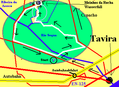 Etwa 8 km nordwestlich von Tavira in der Gegend von Moinhos da Rocha vereinen sich mehrere Bäche zum Rio Sequa, dem Fluß, der auf seinem Weg zum Atlantik Tavira so malerisch durchfließt. Die Stadt Tavira hat in diesem landschaftlich sehr schönem Gebiet mit mehreren kleinen und einem großen Wasserfall neuerdings Bohlenwanderwege samt Picknickplatz, Holzbrücken und mehrere Aussichtsplattformen angelegt, von der Sie in die brodelnden Wassermassen blicken können. Die von uns vorgeschlagene Wanderung dauert etwa 2,5 Stunden und führt über sehr schöne, jedoch sehr sonnige Wege. |